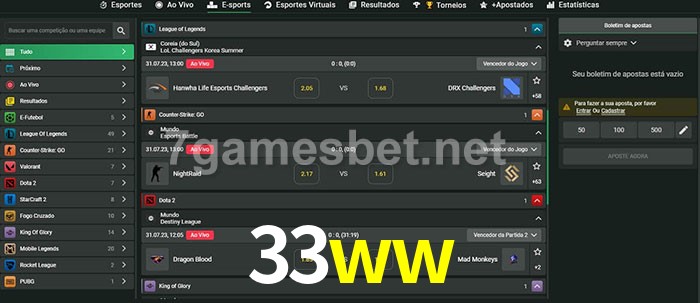 O 33ww oferece uma grande seleção de opções de apostas em e-sports com probabilidades competitivas